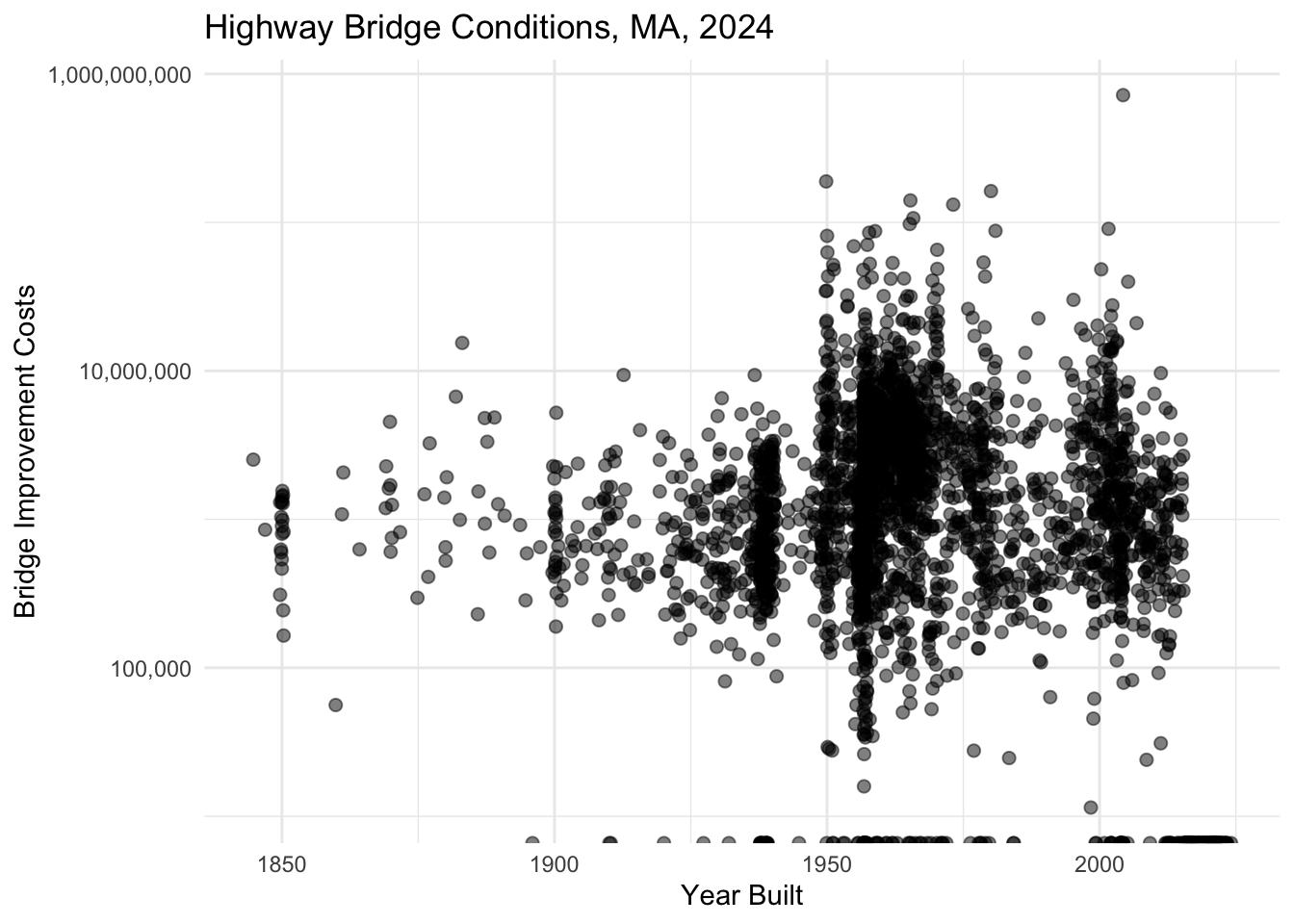 We can adjust the scale of our x and y-axes by adding + scale_x_<type>() or + scale_y_<type>() to our plots. Note what happens when we attempt to create a scatterplot that shows the relationship between the year a bridge was built and the bridge improvement costs for all MA highway bridges.