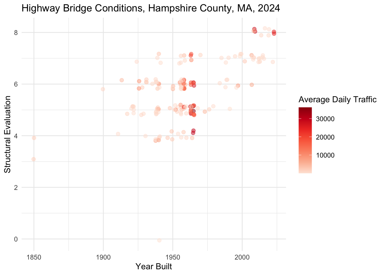 Copy the completed plot from the last exercise below but swap out the variable you mapped to the color aesthetic with a numeric variable from the dataset. Be sure to also adjust the legend label. What kind of palette gets created? What new information do you gain about Hampshire County bridges from the plot? Note your interpretations in your quarto file.