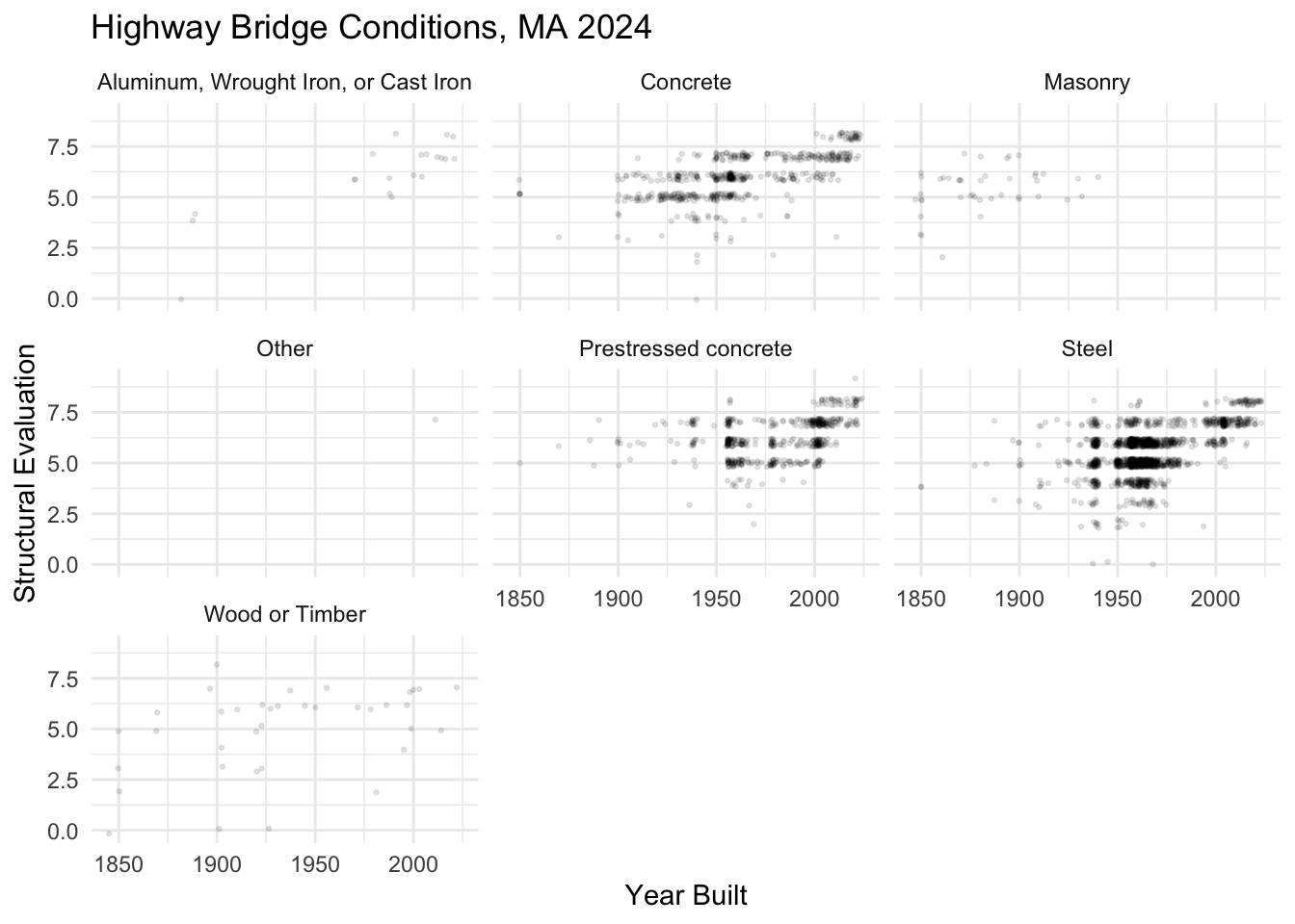 Facet the plot below by STRUCTURE_KIND_043A_L to see the degree of structural deficiencies for different kinds of highway bridges of different ages in Massachusetts. If successful, your plot should look like mine below.