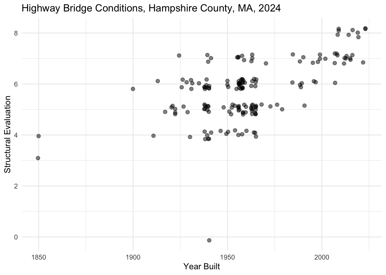 Today, we are going to look at a subset of 2024 NBI data for Massachusetts and for Hampshire County, MA, and we are going to focus solely on highway bridges (excluding pedestrian and railroad bridges). We’re going to look at what kinds of variables might contribute to poor bridge conditions, where there are poor bridge conditions, and which entities are responsible for maintaining them. The data documentation for this dataset is quite thick, so I will provide you with a data dictionary for today.