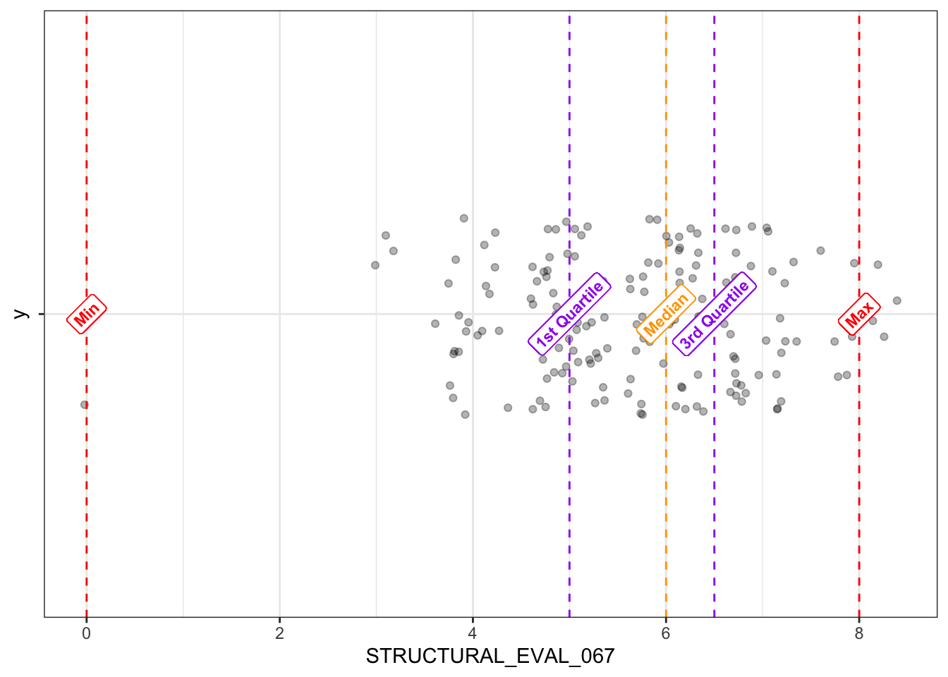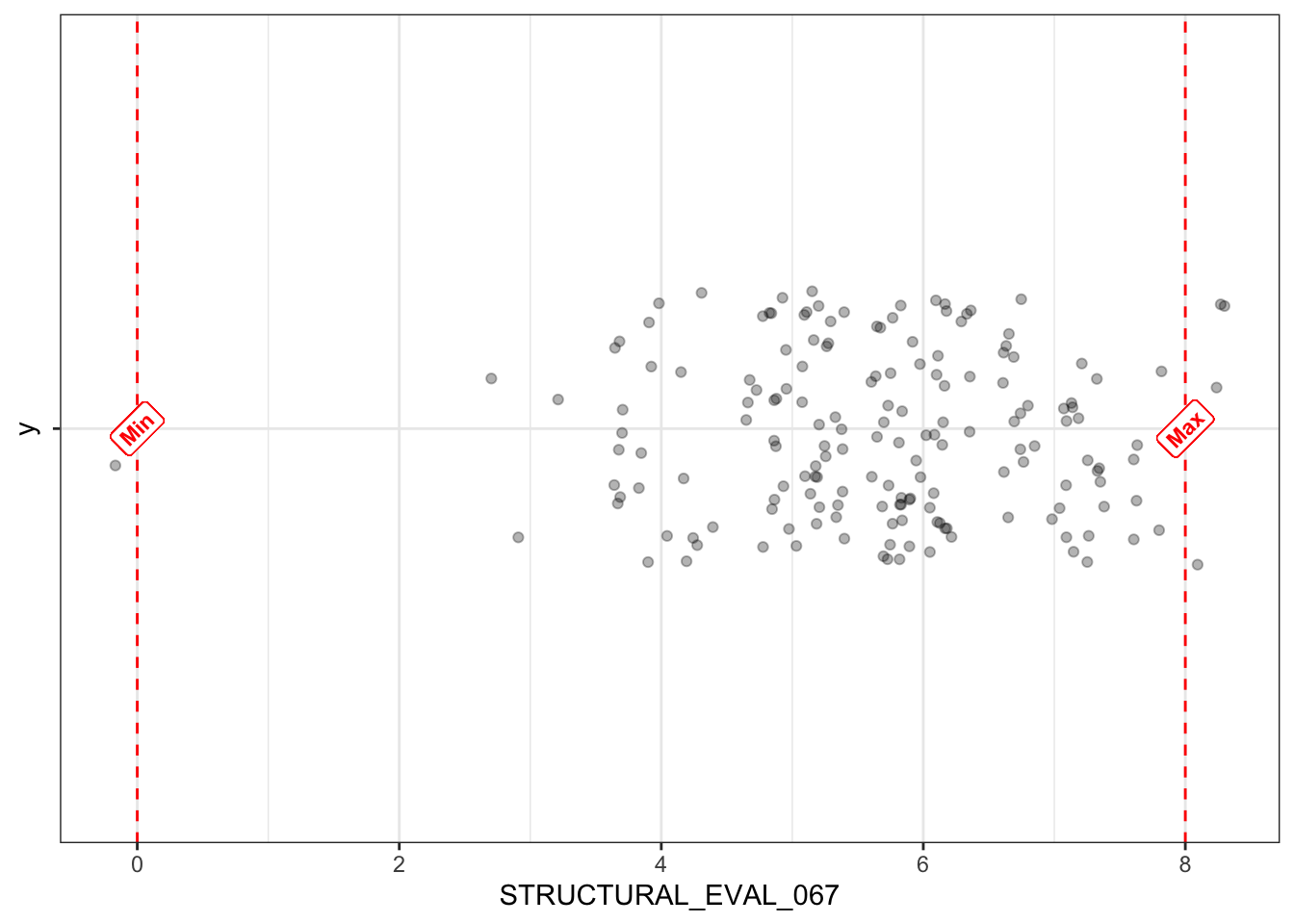 Warning in geom_label(aes(x = min(STRUCTURAL_EVAL_067), y = "", label = "Min"), : All aesthetics have length 1, but the data has 171 rows.